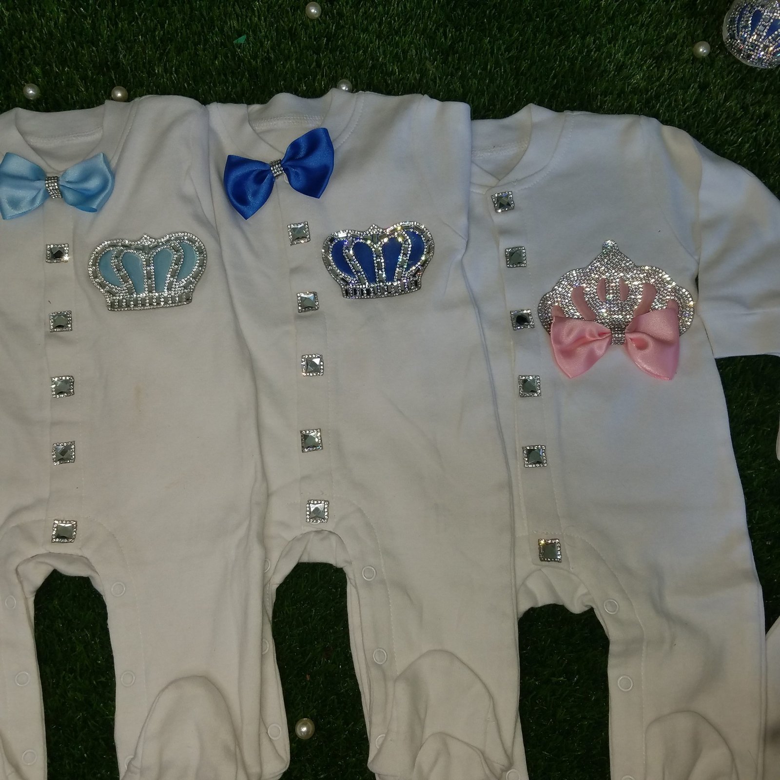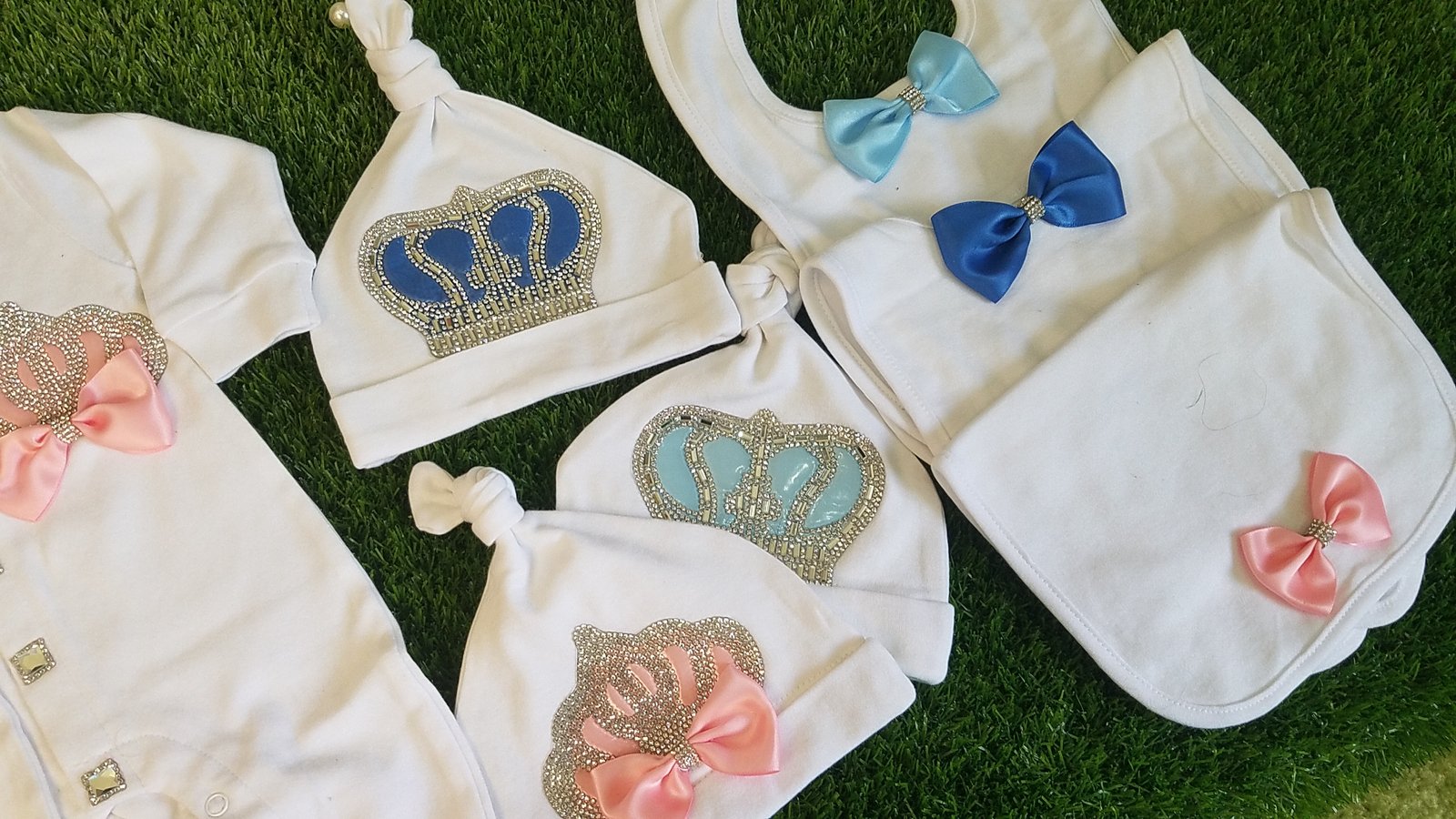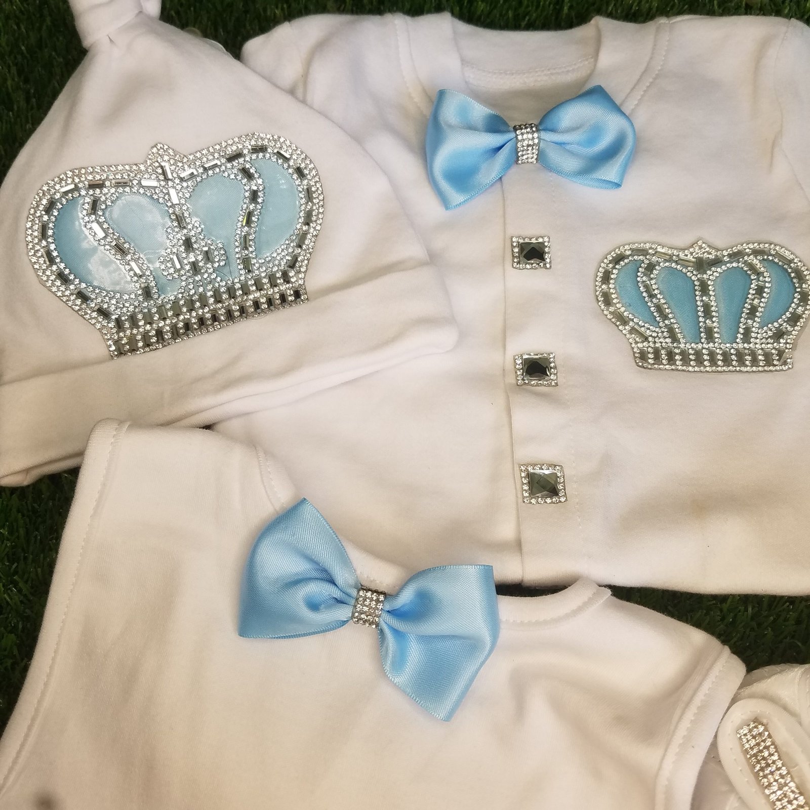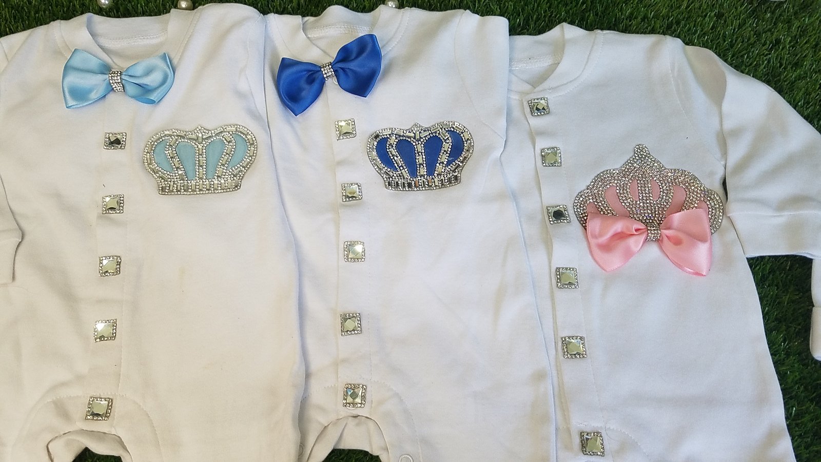 • Soft, thick cotton is embellished with bows, rhinestone buttons, and jeweled crowns.