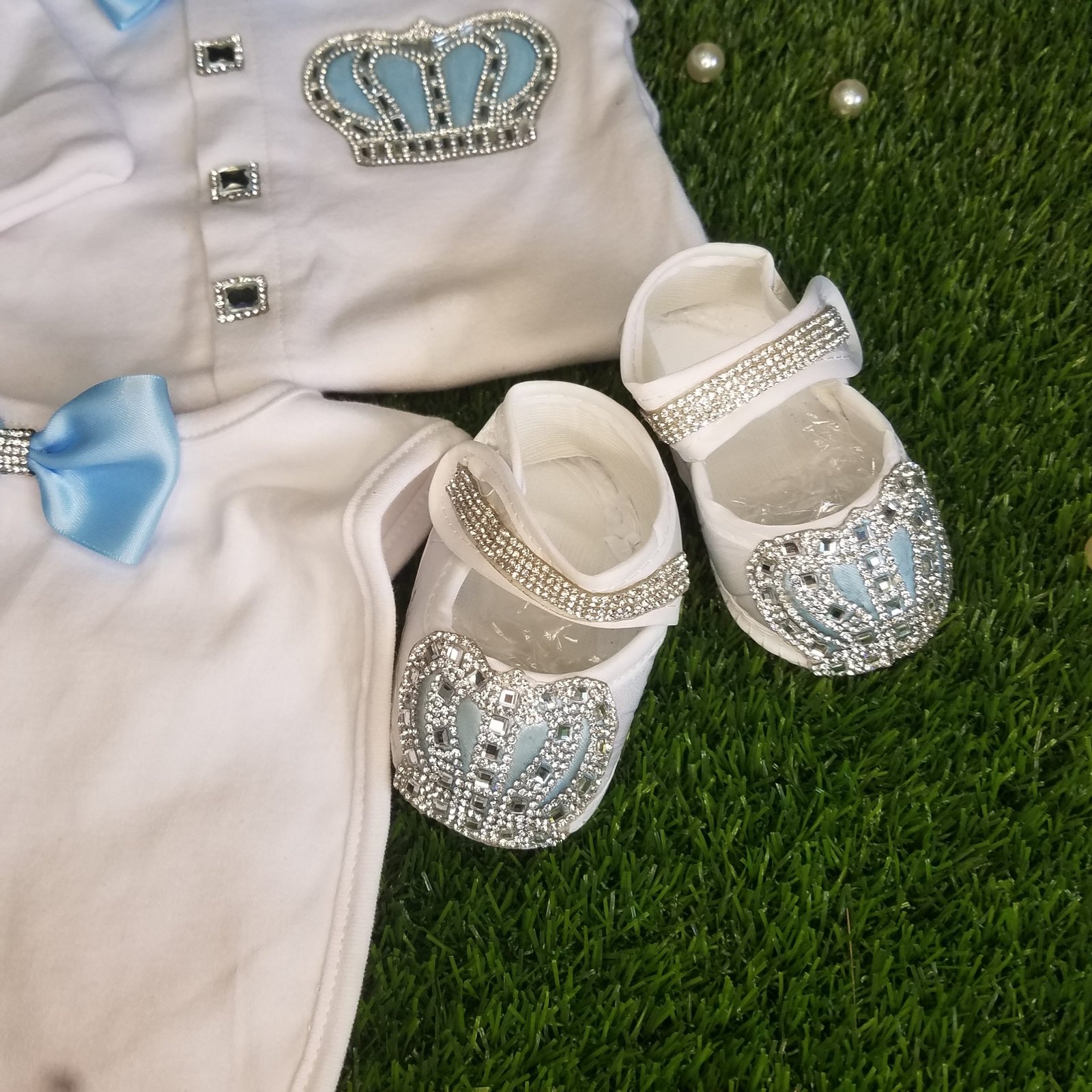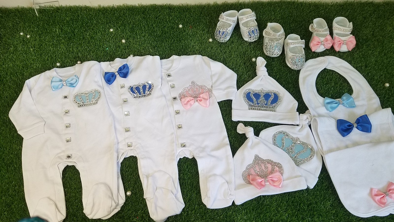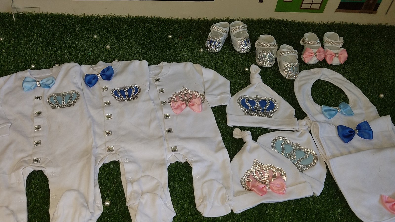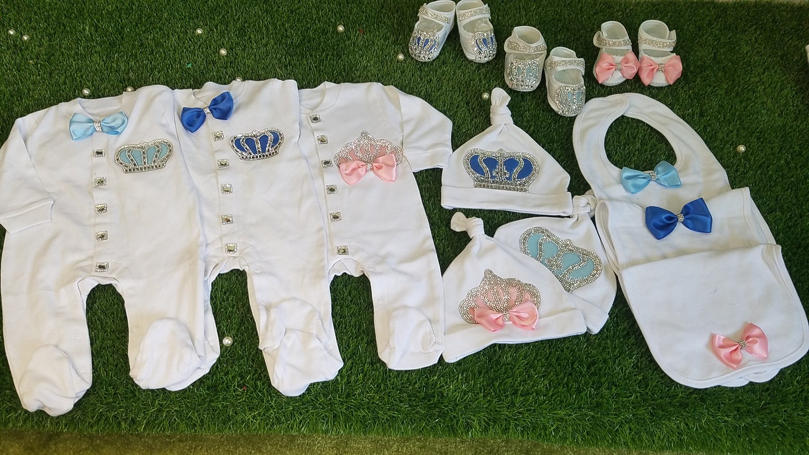 • Soft, thick cotton is embellished with bows, rhinestone buttons, and jeweled crowns.