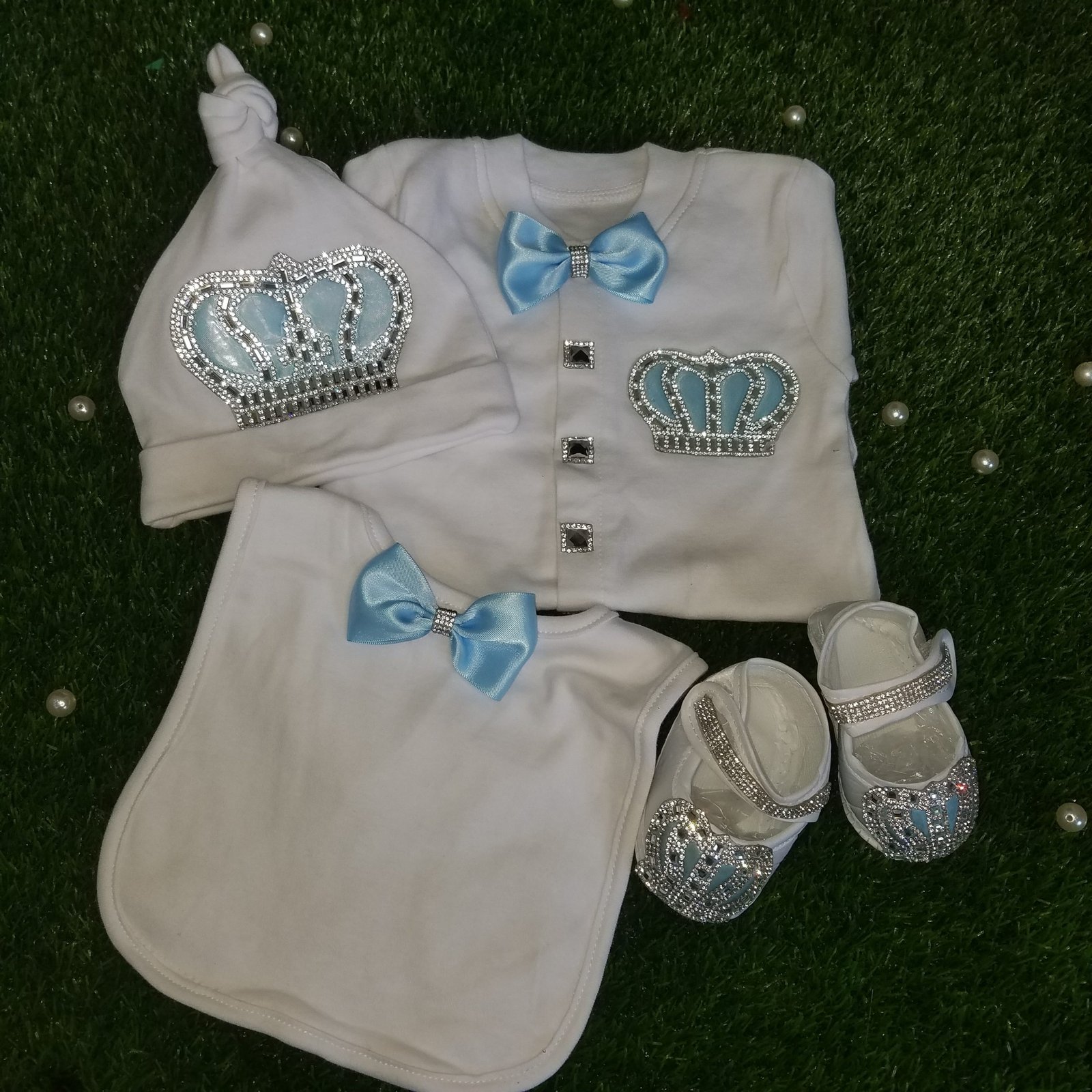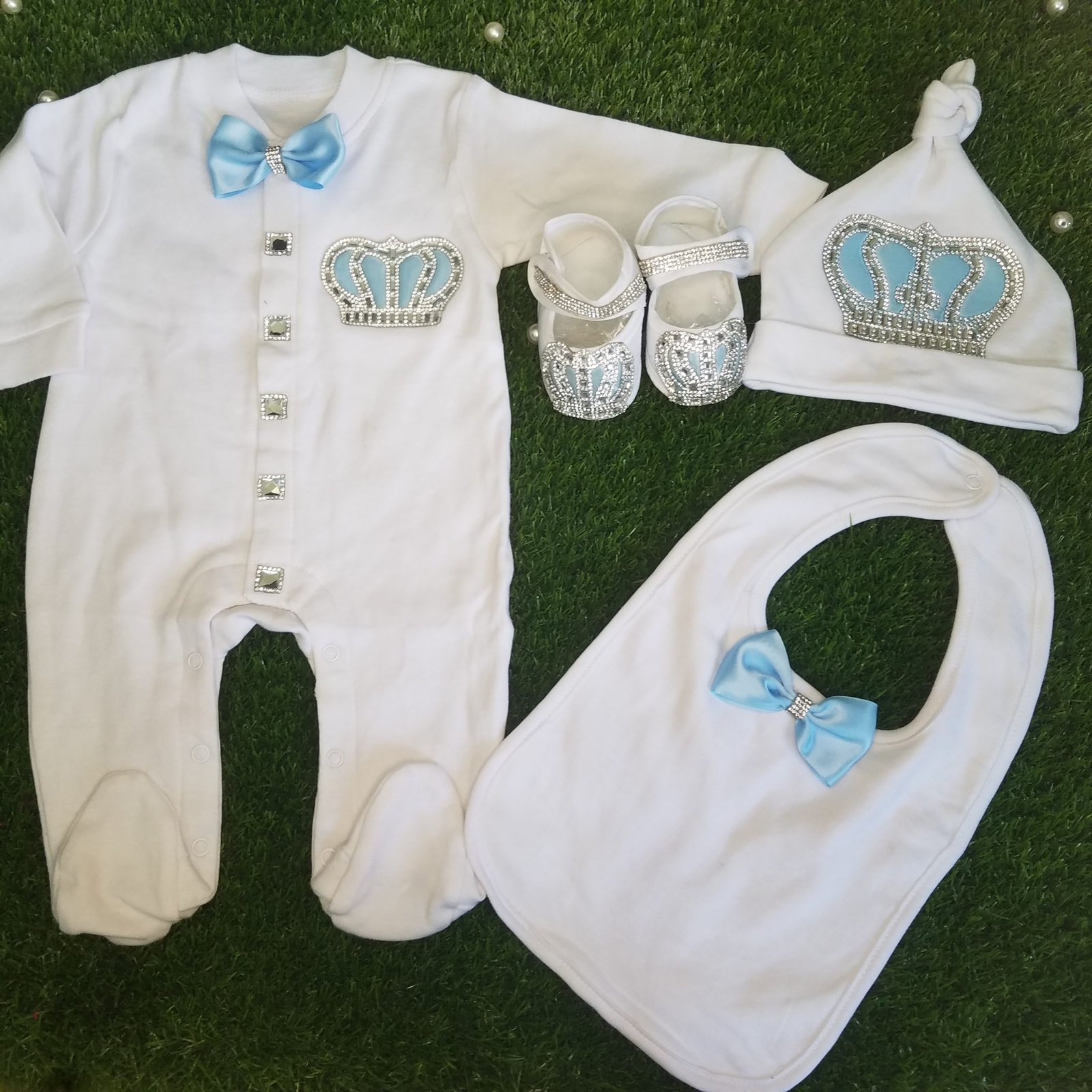 Sky Blue Baby Full Sleeves Body Suit + Bib + Cap Set Jewel Crown 4 season Summer Winter Set
