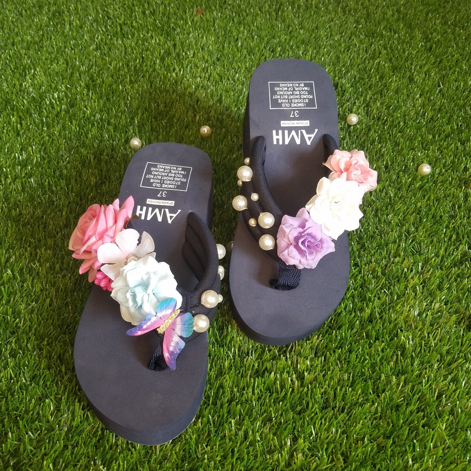 Women Wine Red and White Roses Pearls Wine Red Thick Summer Slipper