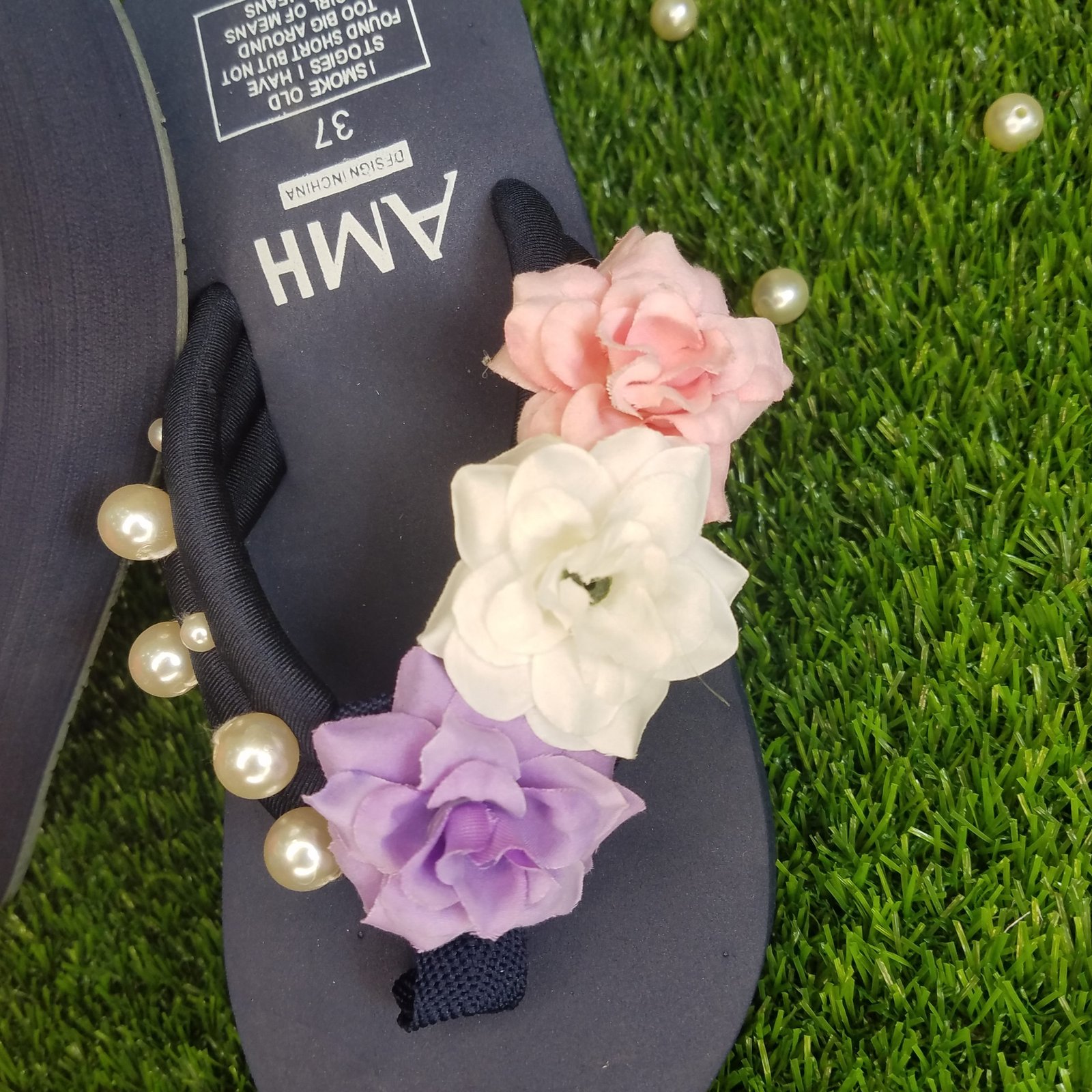 Women Multi Shades Flowers & Pearls Navy Thick Summer Slipper